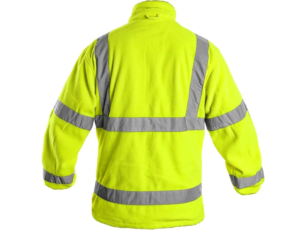Pánská výstražná fleecová bunda s reflexními pruhy. Rukávy do gumy, boční i náprsní kapsy na zip, stahování v dolním okraji, podšívka ze síťoviny. Doporučené použití: stavebnictví, silničáři, řidiči, letecká a lodní doprava, logistika, řidiči kamionů