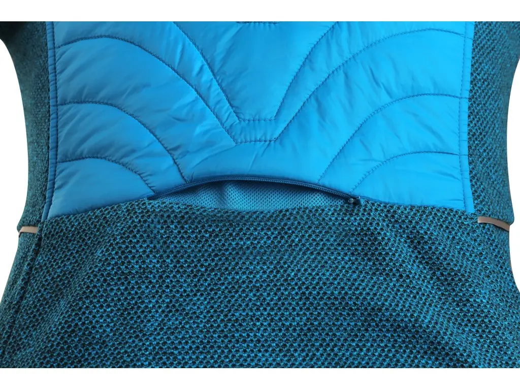 Dámska vychádzková bunda z kombinovaných materiálov. Prešívaná časť je ľahko zateplená, zatiaľ čo kapucňa, boky a rukávy sú z príjemnej pleteniny. Bunda má 2 bočné vrecká na zips, zipsovú ventiláciu na chrbte a reflexné doplnky. Pás a rukávy sú zakončené pružnou gumičkou.