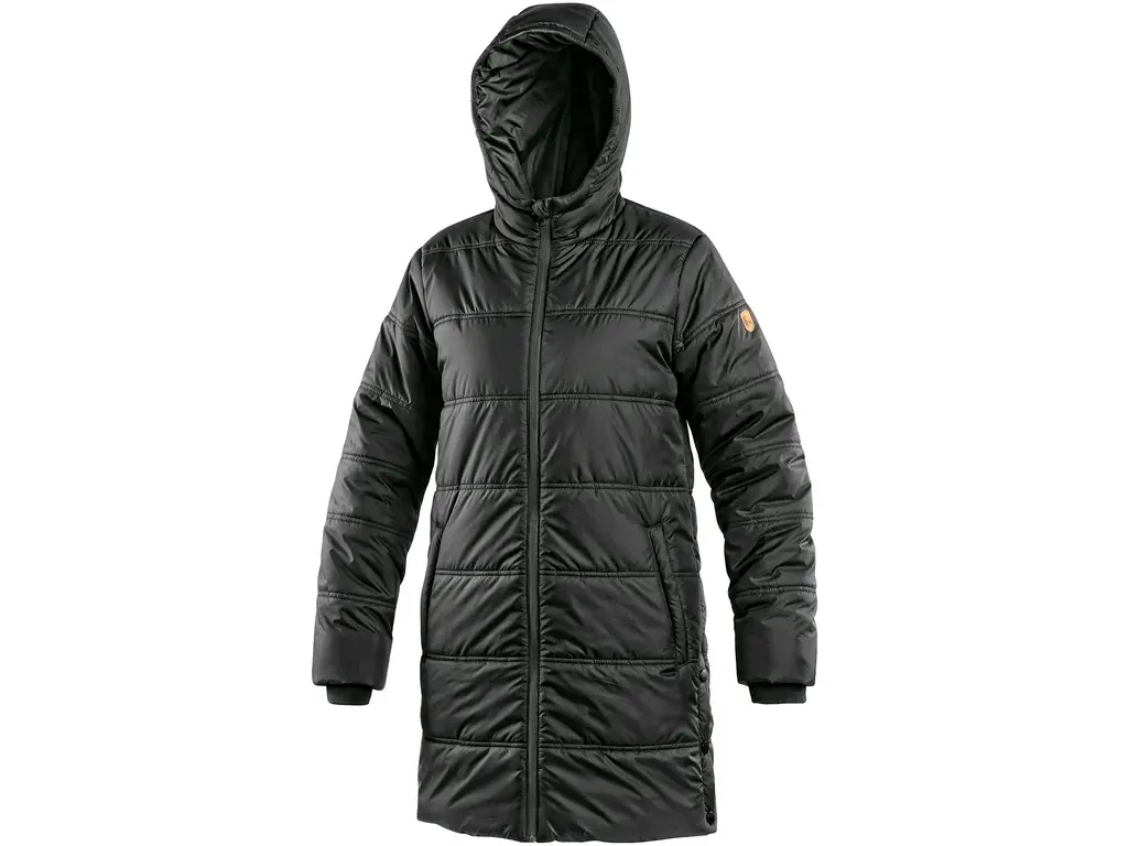 Dámský zateplený kabát s kapucí a bočním rozparkem na druky. Boční kapsy na zip, rukávy ukončeny pružnou manžetou, černé reflexní doplňky na kapuci, rozparku a podél hlavního zipu, vnitřní kapsa na zip.