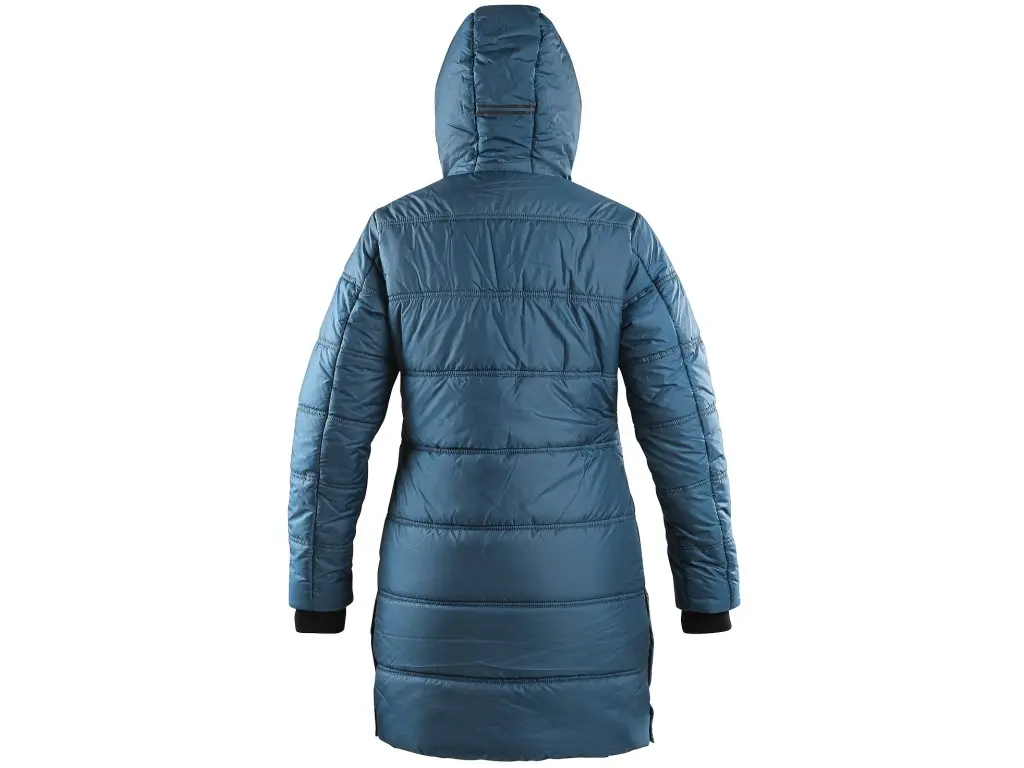 Dámský zateplený kabát s kapucí, oboustranným zipem a bočním rozparkem na druky. Boční kapsy na zip, rukávy ukončeny pružnou manžetou, černé reflexní doplňky na kapuci, rozparku a podél hlavního zipu, vnitřní kapsa na zip.