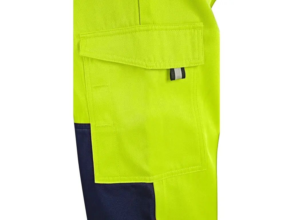 Pánské výstražné kalhoty, pas s poutky na opasek a gumou v bocích, 2 přední kapsy, 2 zadní kapsy, jedna s klopou, kryté přední zapínání na zip, boční multifunkční kapsy, stehenní zipová kapsa s vnitřním pouzdrem na ID kartu, kolena zesílena materiále