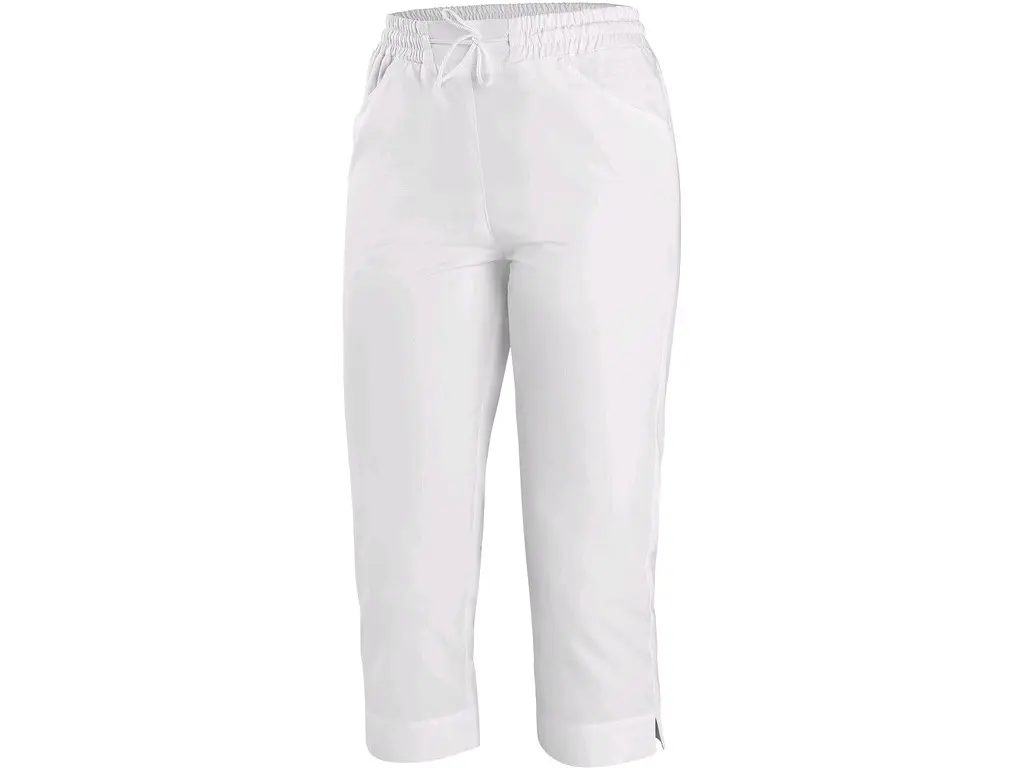 Dámské pohodlné 3/4 kalhoty, pas do gumy se šněrováním, 2 přední prostorné klínové kapsy, nohavice do manžety s rozparkem. Doporučené použití: soukromé ordinace, kliniky a velká zdravotnická zařízení, záchranné a zdravotní dopravní služby, lázeňská zařízení, ústavy sociální péče, lékárny, školy se zdravotnickým a gastro zaměřením.