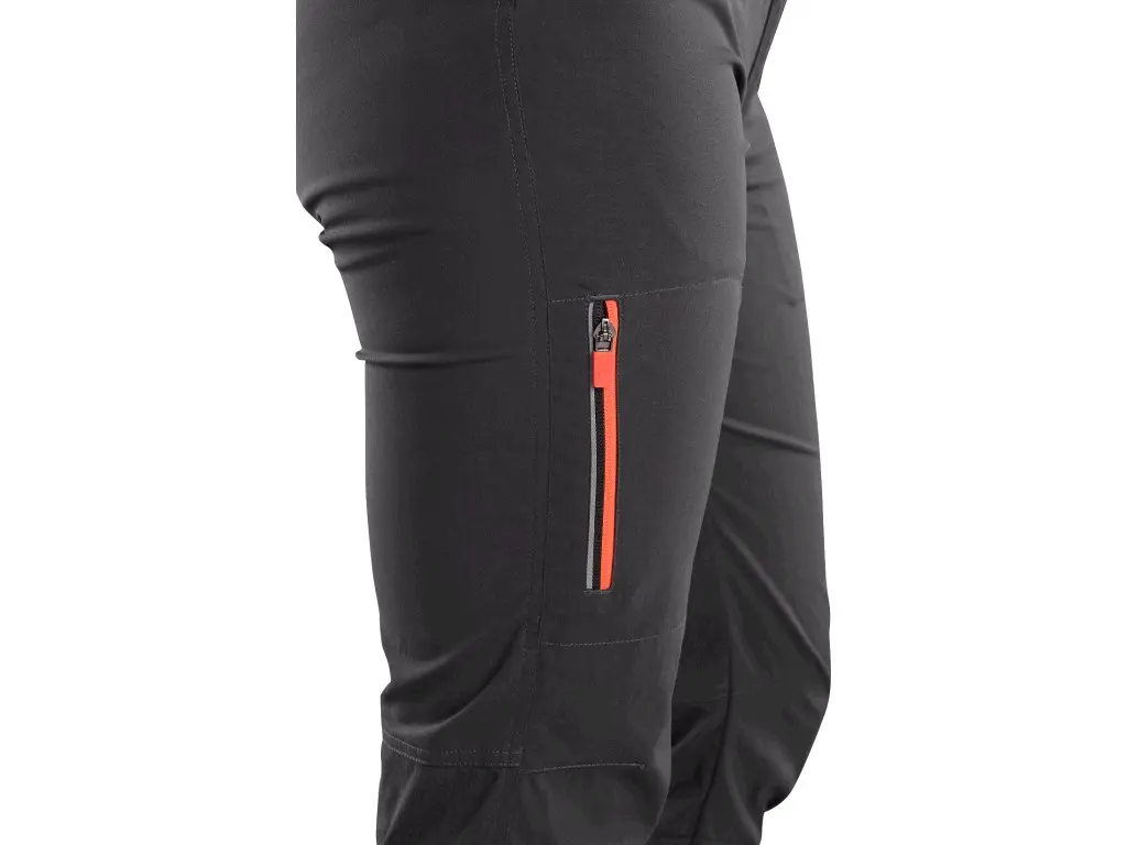 Dámské letní kalhoty pro volný čas, pevný pas s páskem a vnitřním protiskluzovým potiskem, kapsa na zip na pravém stehně, zadní kapsa na zip, větrání v zadní kolenní části, reflexní doplňky.