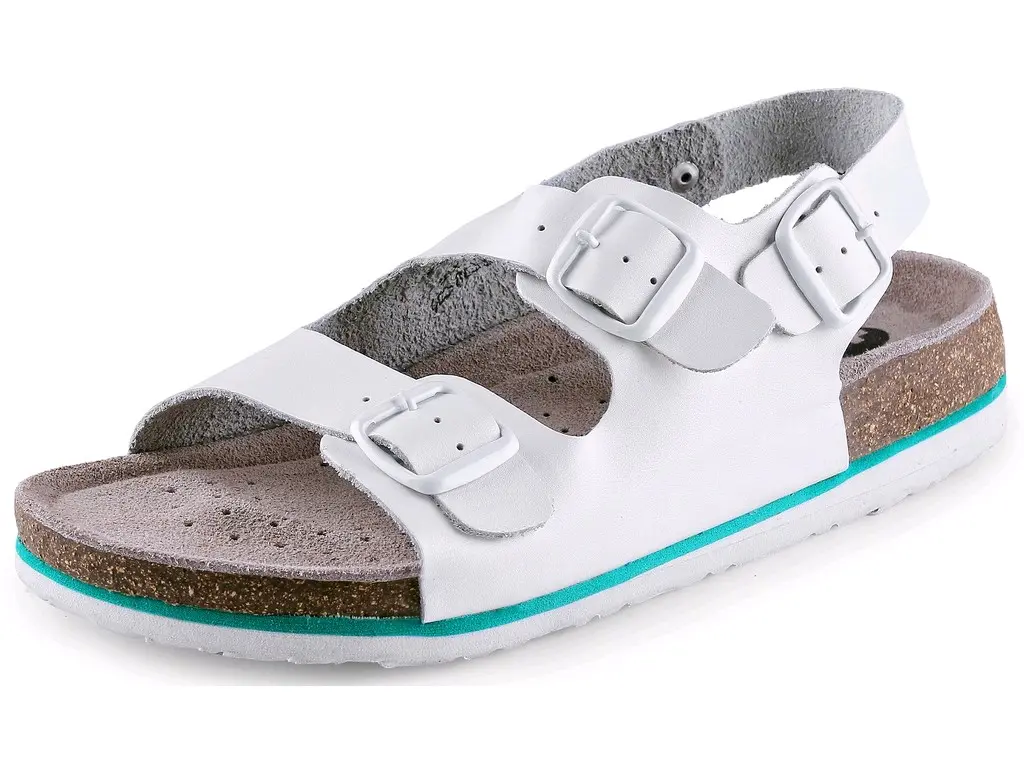 Sandál, dámský, celokožený s dvěma nártními pásky a páskem kolem paty, podešev na klínku.