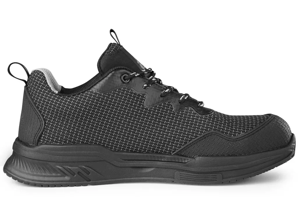 Pracovná poltopánka bez kovových súčastí, s reflexnými doplnkami. Materiál: zvršok z 2 mm odolného materiálu PU-TEK (nylon potiahnutý rezistentnou TPU vrstvou), pätová aj okopová časť zo štruktúrovaného TPU materiálu. Textilná podšívka s ochranou vnútornej pätovej častiz mikrovlákna, pohodlná vyberateľná stielka z vysokohustotnej polyesterovej peny. Podošva: veľmi ľahká, protišmyková, antistatická, olejuodolná, jednohustotná podrážka z ľahčenej penovej gumy. Obuv je ideálna na pohodlný pohyb pri práci bez zvýšených rizík, napríklad v logistike, skladoch, servise, ľahkej výrobe, predajniach, administratívnom zázemí, zásobovaní alebo pri šoférovaní.