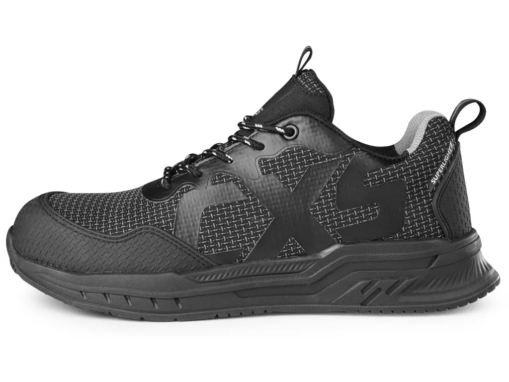 Bezpečnostná poltopánka, bez kovových súčastí, reflexné doplnky. Materiál: kompozitová špica a textilná antipenetračná planžeta, zvršokz 2 mm odolného materiálu PU-TEK (nylon potiahnutý rezistentnou TPU vrstvou), pätová aj okopová časť zo štruktúrovaného TPU materiálu. Textilná podšívka s ochranou vnútornej pätovej časti z mikrovlákna, pohodlná vyberateľná stielka z vysokohustotnej polyesterovej peny. Podošva: veľmi ľahká, protišmyková, antistatická, olejuodolná, jednohustotná podrážka z ľahčenej penovej gumy. Obuv je vhodná pre širokú škálu pracovných prevádzok, kde je potrebné chrániť nohy, napríklad vo výrobe, skladoch, dielňach, stavebníctve, údržbe, technických službách aj logistike.
