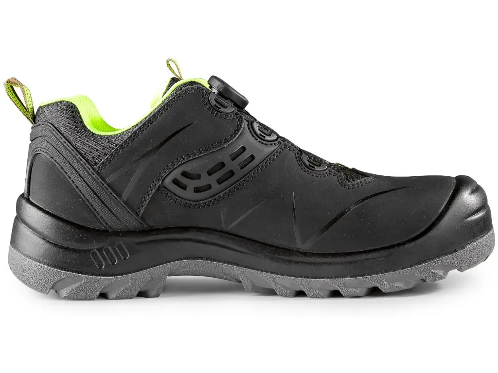 Bezpečnostní kožená polobotka s plastovou špicí a planžetou Dyna-Flex®, reflexní doplňky. Speciální utahovací systém umožňuje rychlé stažení i uvolnění obuvi. Materiál: svršek z 1,6 - 1,8 mm štípenkové nubukové kůže (z jednoho dílu), vnější PU ochrana okopu a TPU ochrana paty, podšívka z prodyšné oděru odolné textilie, podešev: PU-PU, olejivzdorná, antistatická, protiskluzová a odolná proti propichu.