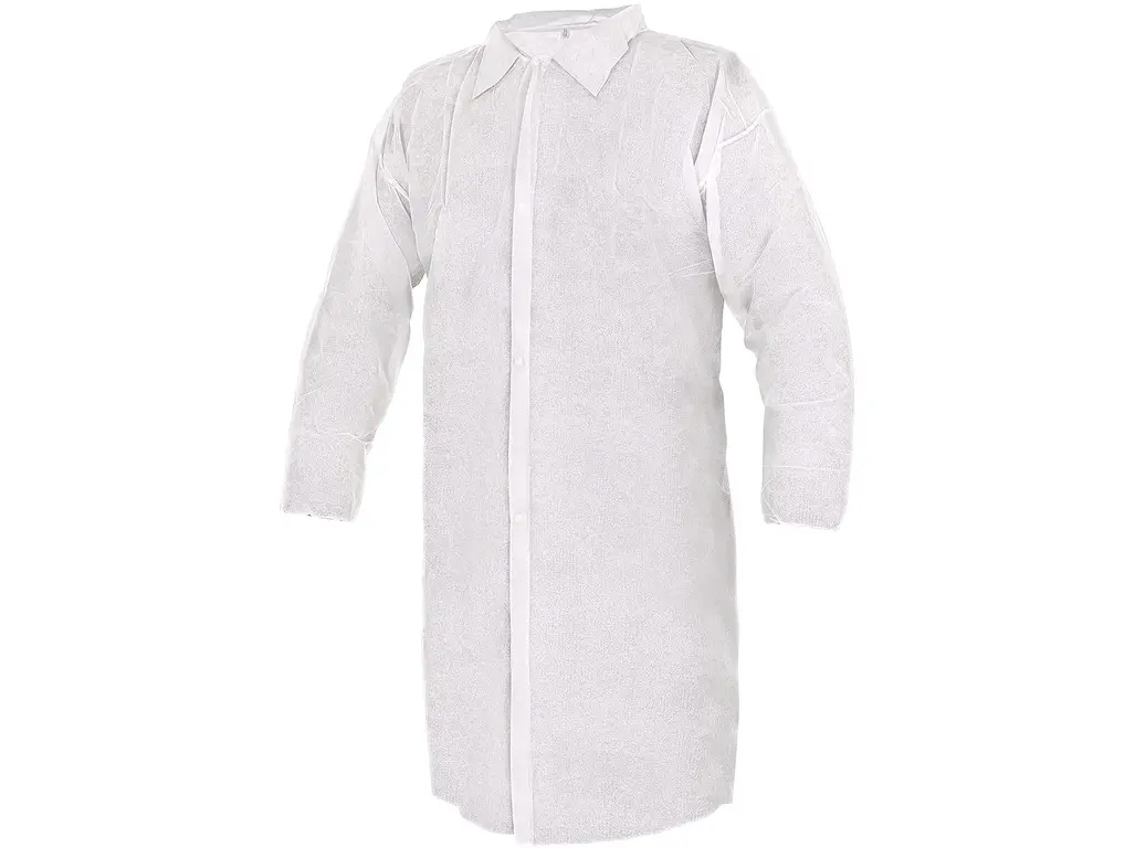 Jednorázový návštěvnický plášť z netkané textilie, zapínání na druky, rukávy do gumičky. Chrání před prachem a lehkým zašpiněním. Doporučené použití: potravinářství, kosmetika, zdravotnická zařízení, kde není požadavek na sterilní oděv.