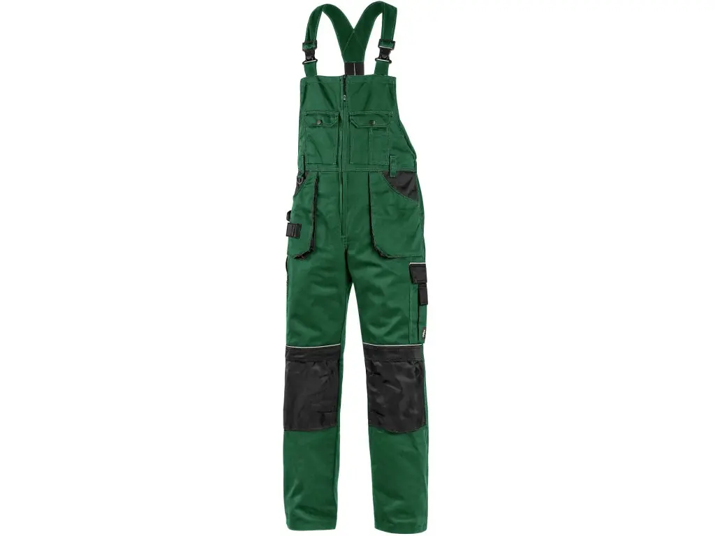Pánské montérkové kalhoty s náprsenkou, náprsní kapsy s klopami, pas s poutky na opasek, vzadu do gumy, přední kapsy s poutky na nářadí, multifunkční kapsy na obou stranách, kolena zesílena 600D polyesterem s možností vložení kolenních výztuh, dvě zadní kapsy, jedna na suchý zip, šle s gumou vzadu, reflexní doplňky. Doporučené použití: stavebnictví, strojírenství, lehký průmysl, automobilový průmysl, logistika, skladová manipulace, spedice, autoservisy, údržba, montáže, zemědělství, zahrada, hobby.