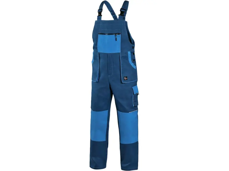 Pánské montérkové kalhoty s náprsenkou, náprsní kapsa na zip, pas vzadu do gumy, přední kapsy, boční kapsa na svinovací / skládací metr, boční kapsa na mobil / peněženku, zdvojená kolena, zadní kapsa s klopou, šle s gumou vzadu, reflexní doplňky. Doporučené použití: stavebnictví, lehký průmysl, logistika, skladová manipulace, autoservisy, údržba, montáže, zemědělství, zahrada, hobby.