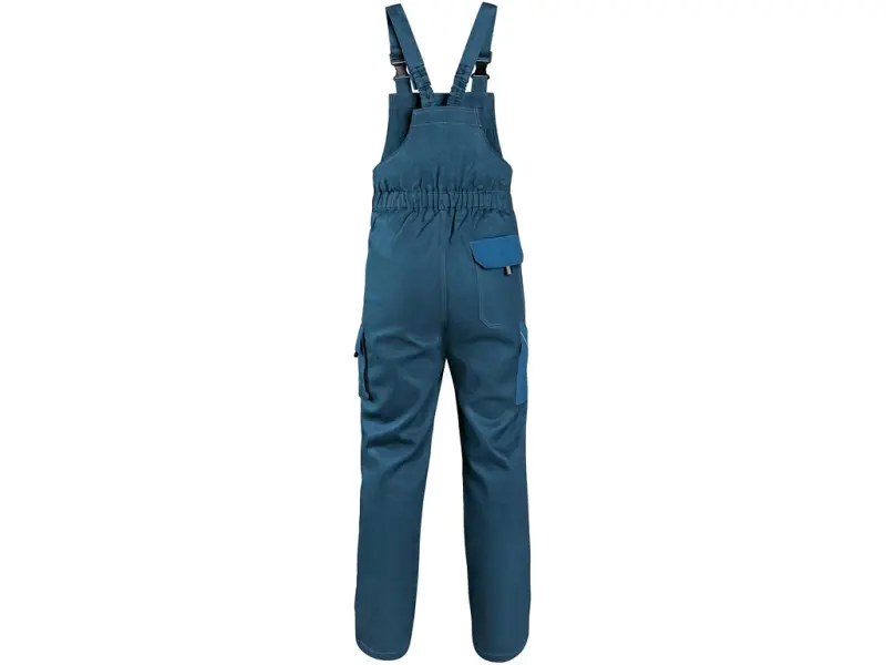 Pánské montérkové kalhoty s náprsenkou, náprsní kapsa na zip, pas vzadu do gumy, přední kapsy, boční kapsa na svinovací / skládací metr, boční kapsa na mobil / peněženku, zdvojená kolena, zadní kapsa s klopou, šle s gumou vzadu, reflexní doplňky. Doporučené použití: stavebnictví, lehký průmysl, logistika, skladová manipulace, autoservisy, údržba, montáže, zemědělství, zahrada, hobby.