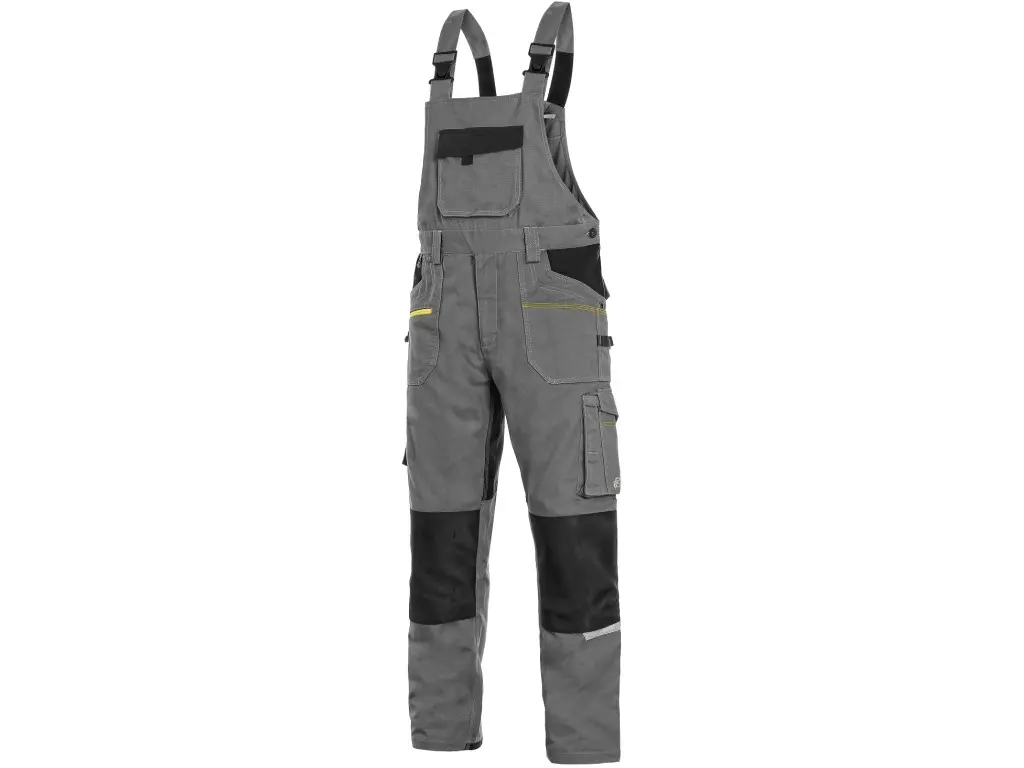 Pánské montérkové kalhoty s náprsenkou - zkrácená varianta na výšku 170-176 cm. Strečová tkanina umožňující volný pohyb, náprsní kapsa s klopou, pas s poutky na opasek, přední kapsy s kapsou na zip, multifunkční kapsy na obou stranách, kolena zesílena 600D polyesterem s možností vložení kolenních výztuh, dvě zadní kapsy - jedna s klopou, zadní spodní lem nohavice vyztužen 600D polyesterem, šle s gumou vzadu, reflexní doplňky. Doporučené použití: strojírenství, stavebnictví, lehký průmysl, automobilový průmysl, logistika, skladová manipulace, spedice, autoservisy, údržba, montáže, zemědělství, zahrada, hobby.